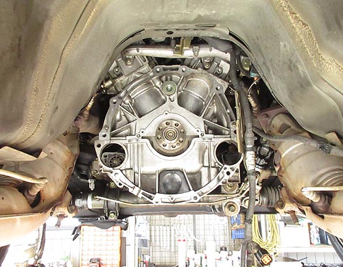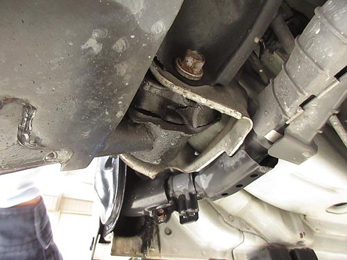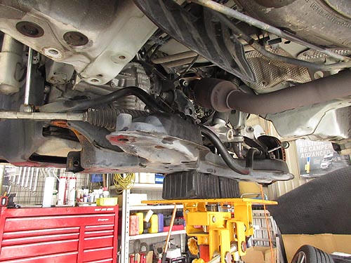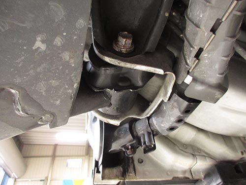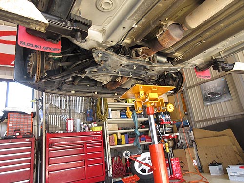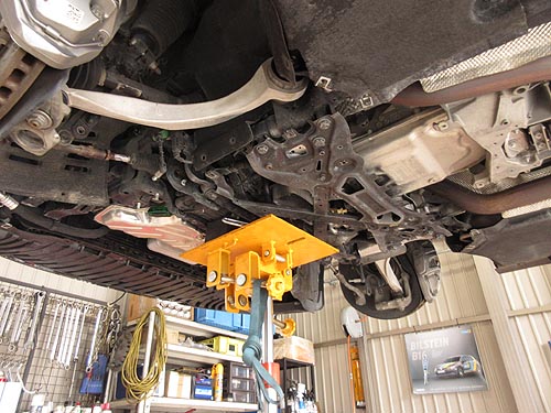 | エンジンマウントの交換はなかなか難しく ミッションジャッキを2本使って作業しています。 | |