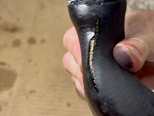 | リアアクスルブッシュの状態はこんな感じです。 やはり大きく裂けている。 | |