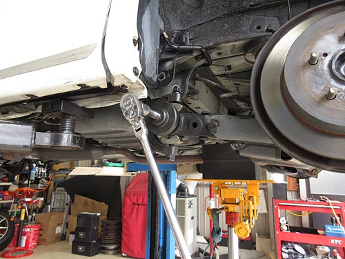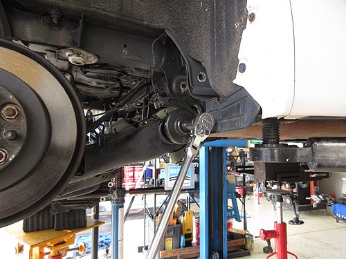| 細いボルトは簡単に折れてくれる。 何箇所ナットを切断したことか。 タイロッドエンドのナットは固着していて、 真っ赤になるまで暖めて緩めました。 | |