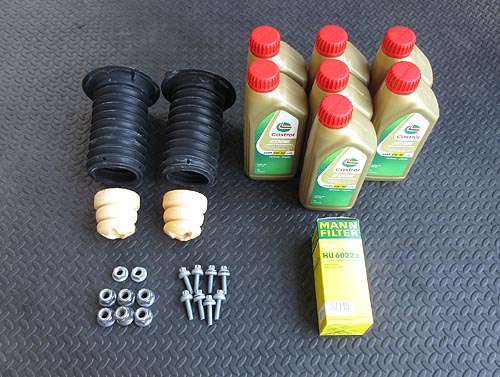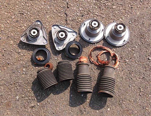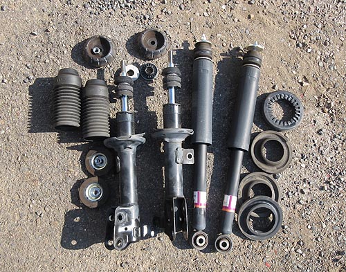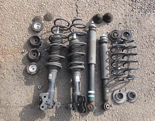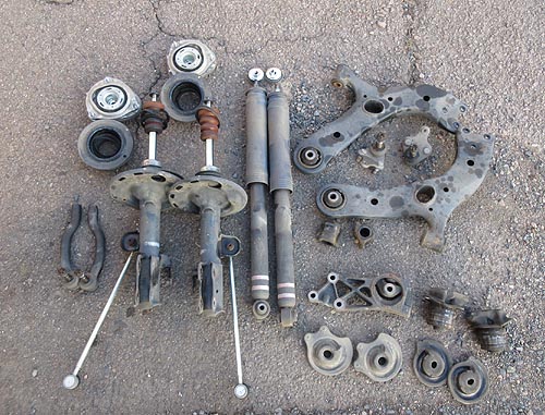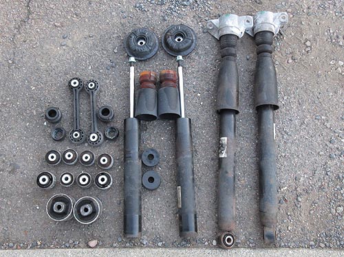 | 外したノーマルパーツ達です。 10万キロお疲れ様でした。 BMWらしく、バンプラバーはバラバラになっていますね。 決算棚卸しも同時進行していて、猛烈に忙しくしています。 |