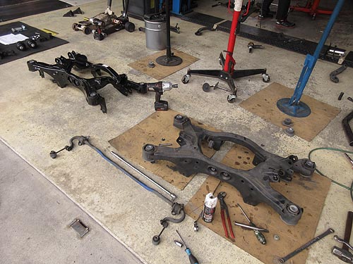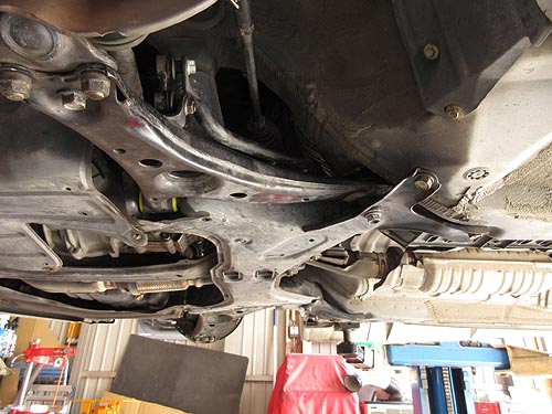 | フロントロアーアームを交換しているところ クロスメンバーも下して作業しています。 かなり大掛かりな作業となっていました。 | |