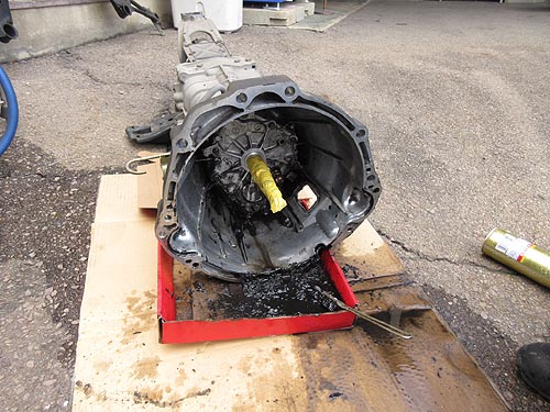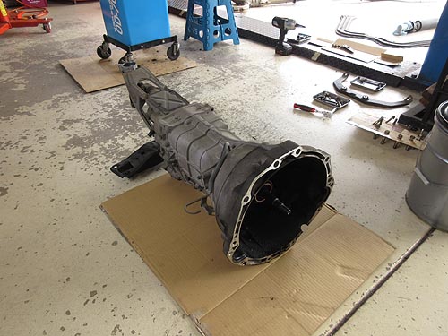 | リジカラはとっても慎重に作業を行なっています。 クロスメンバーをミッションジャッキで支えて下げます。 | |