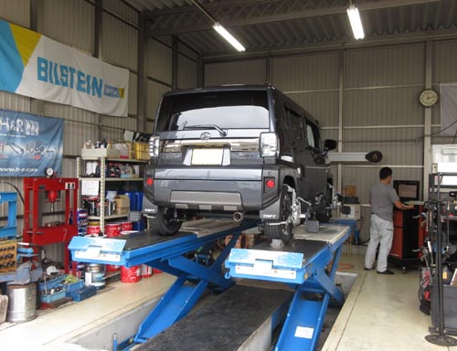 を アライメント調整しました。 リフトアップされて、大口径タイヤを履かれていますが 干渉してしまいアライメントで出来るだけ補正します。 | |