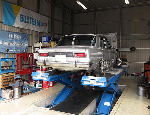| 2025.10.12 またも旧車 ニッサン スカイライン GC10 箱スカ をアライメント調整 車高調キットを装着されての点検調整でした。 クロスメンバーも触って調整しました。 |