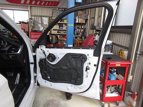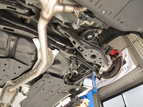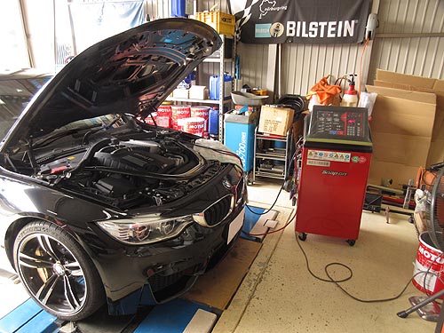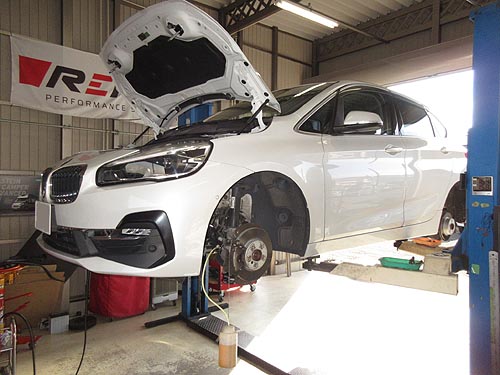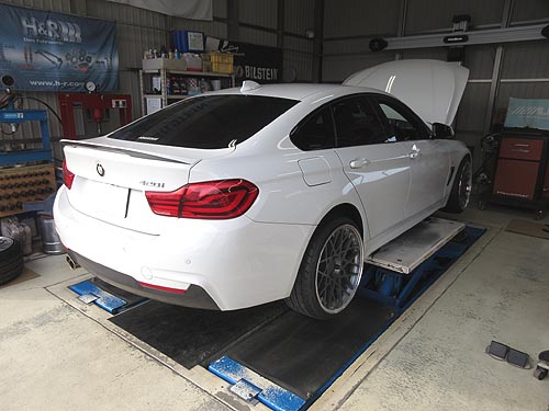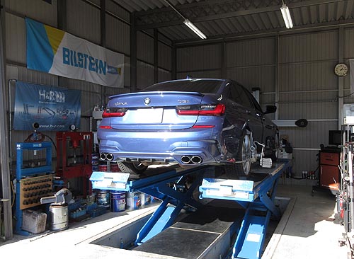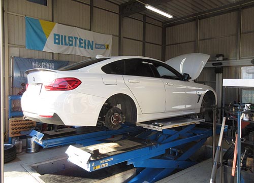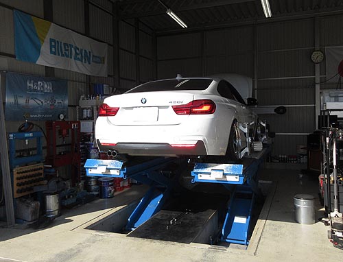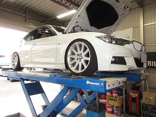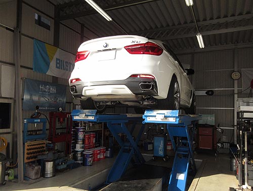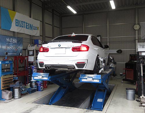 | 当日は別のクルマ BMW F31 320i も同じ作業をしています。 持ち込みのレムスマフラーを装着する予定でしたが、 部品が足らず、当日は付けられませんでした。 |