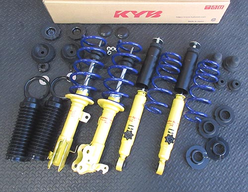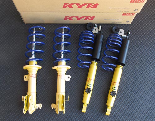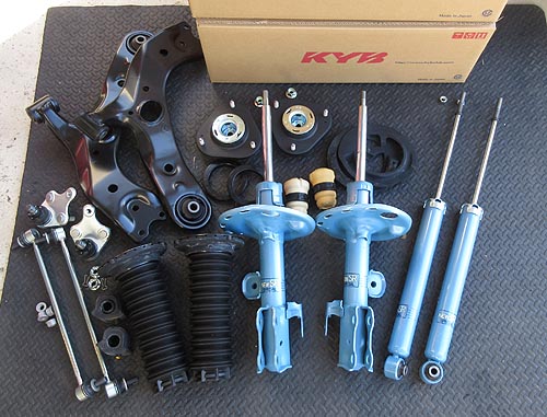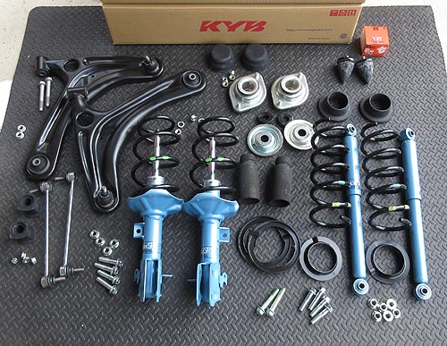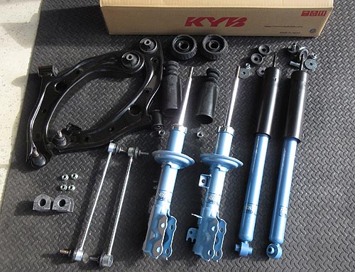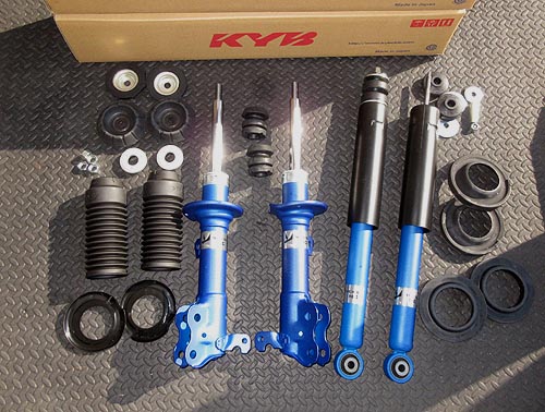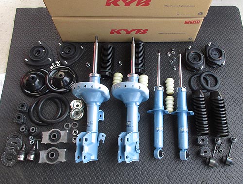 に KYB ニューSRショックを装着しました。 前後のアッパーマウント等の消耗パーツと フロントロアアーム関係のブッシュ類もご用意しました。 |