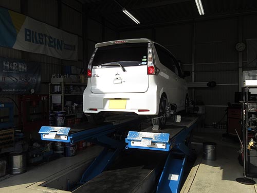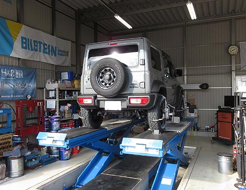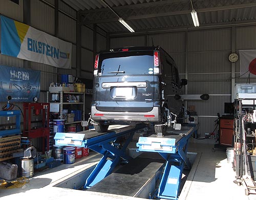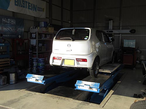 | 装着して、アライメントリフトの上で、 左右の出幅を調整して完成しました。 |