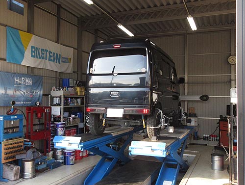 | まさに、ゼロから作られている感じです。 ラダーフレームに、エアサスが付けられていて 後々ボディが乗せられます。 ボディが無い状態でアライメントを調整する理由は ボディが付くとホイールが隠れるんだとか。 |