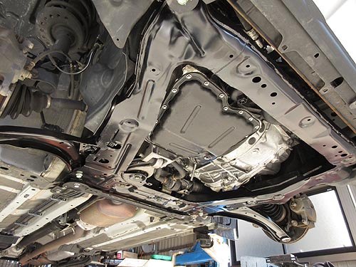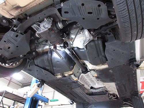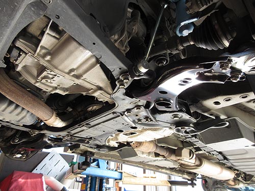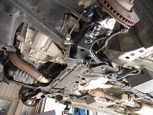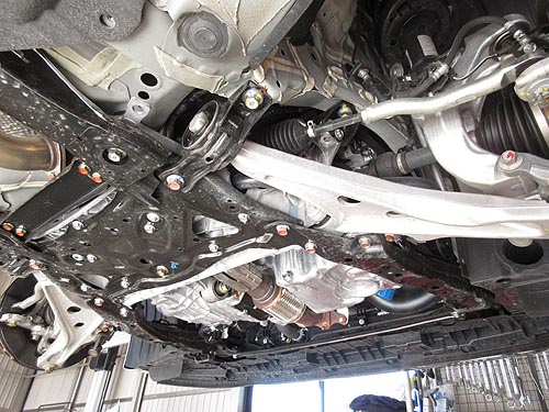 | リアアクスルブッシュはいつものように、 マフラーを外して、アクスルを下げて作業しますが、 ハイブリッドは、リアにモーターが有るから FFに比べると手間がかかります。 |
