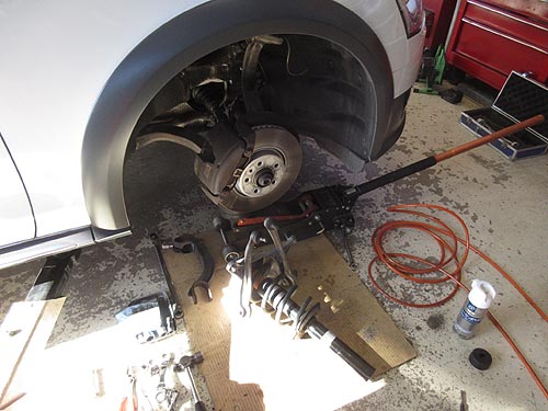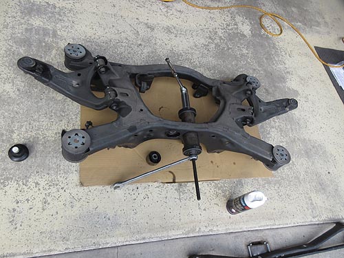 | いつものようにロアアームを外して ブッシュをプレスで交換します。 たまには違う角度から撮影しました。 |