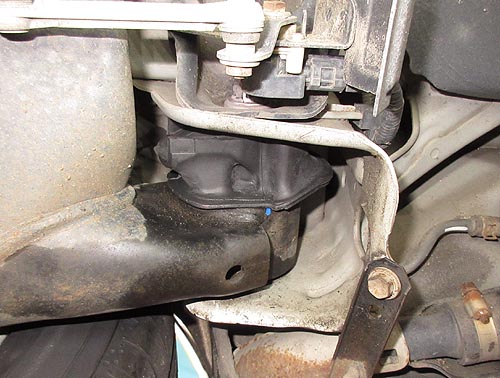 | エンジンマウントの交換はなかなか難しく ミッションジャッキを2本使って作業しています。 |
