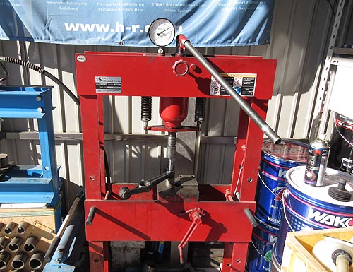 | フロントアームを外して プレスでブッシュを打ち換えします。 |