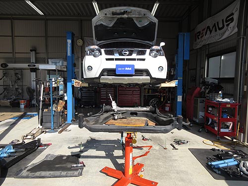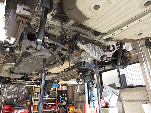 | リジカラはとっても慎重に作業を行なっています。 クロスメンバーをミッションジャッキで支えて下げます。 |