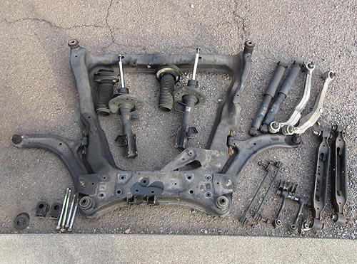 | 外したノーマルパーツ達です。 キロお疲れ様でした。 セレナ等ニッサン車の多くが、このフロントメンバーを利用していまして マウントブッシュの劣化から、ゴトゴト音が出ていると思います。 |