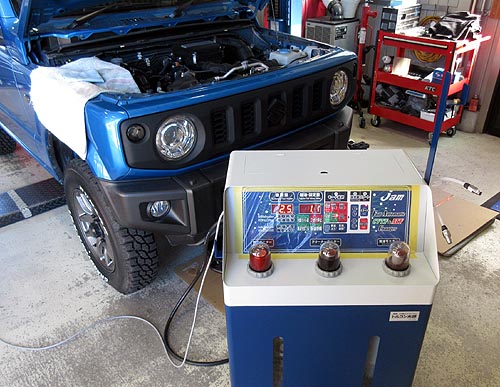 | スズキ ジムニー JB23W に エアコンガスリフレッシュを施工しました。 基準ガス充填量 400g に対して 回収量は 100gでした。 さすがに減っていましたね。 WAKOSパワーエアコンも添加して完成です。 |
