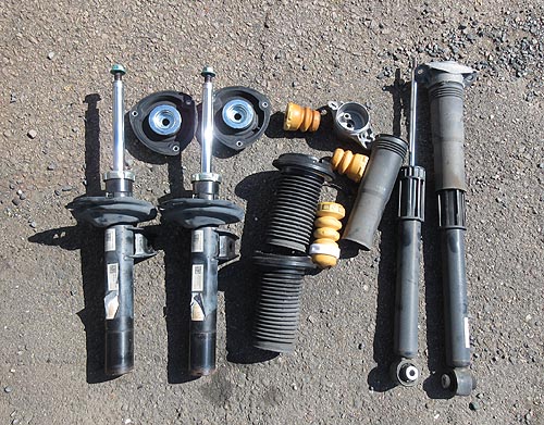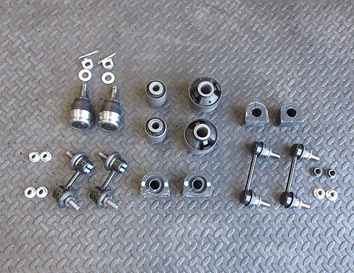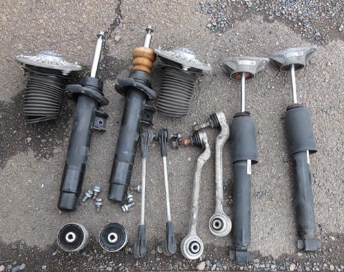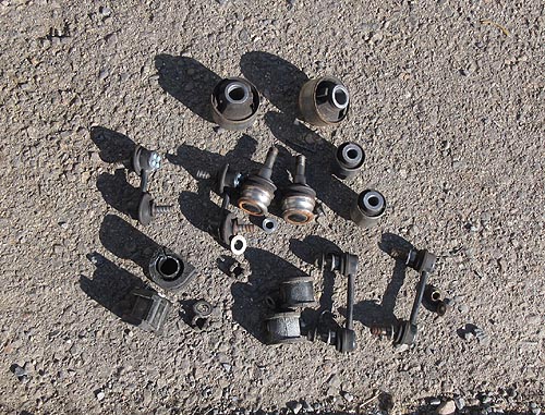 | 外したノーマルパーツ達です。 10万キロ お疲れ様でした。 まあまあサビによる腐食が見られました。 これだけ交換しますと、足回りは新車ですね。 |