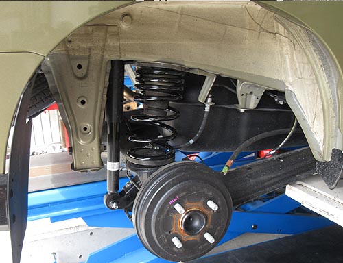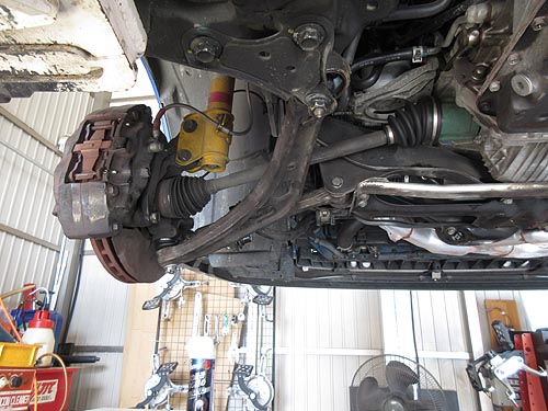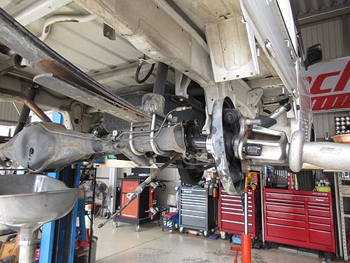 | マフラーを外して、ブレーキホースを切り離しして リアアクスル全体を下げる。 |