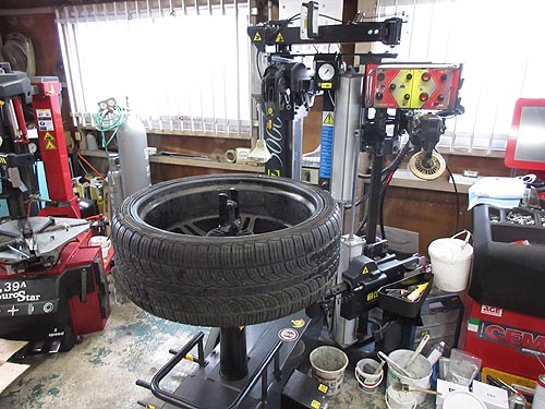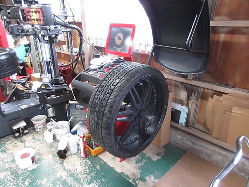 | 当社で組換えが出来る最大外径のサイズ 275/25R28 のタイヤ交換を行ないました。 タイヤがあまりにも薄いので、非常に神経を使って交換します。 |