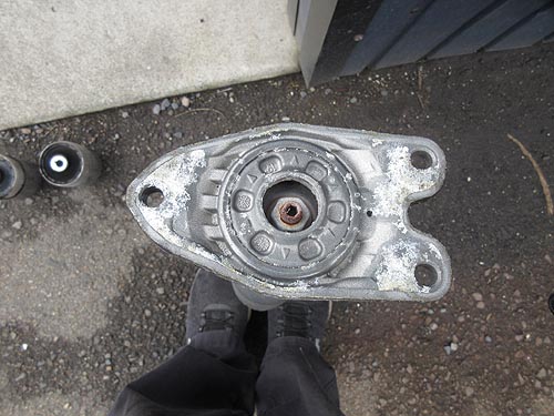 | リアアクスルブッシュも交換します。 交換前の状態です。 まあまあひどいです。ヒビヒビですね。 |