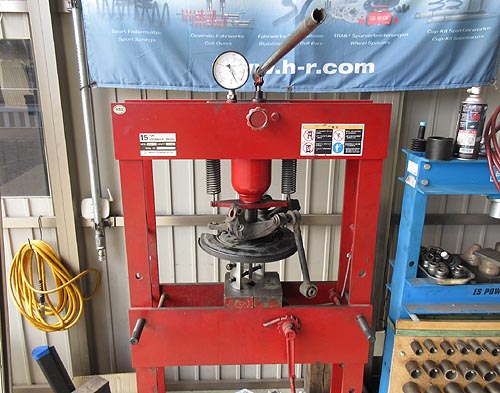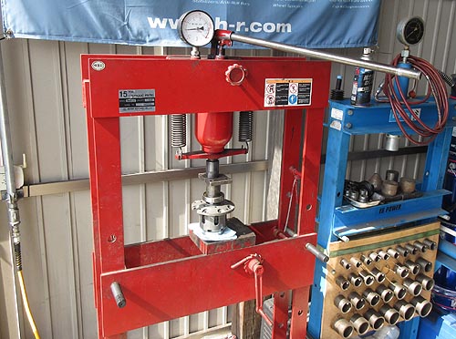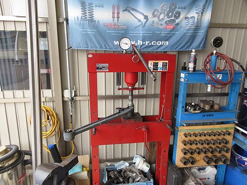 | 新品ハブベアリングを圧入 このプレス作業は手馴れています。 |