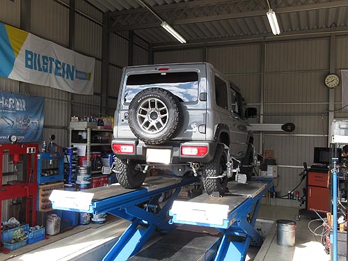 | 昨日の続き スズキ ジムニーシエラ JB74W をアライメント調整 車高は変わらないけれど、下回りを分解しているから やはりアライメント調整は必要でした。 |