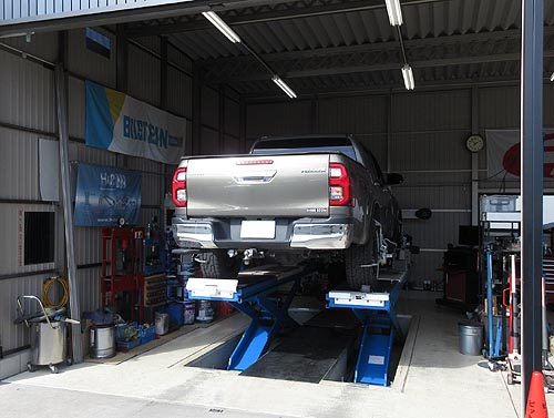 | トヨタ ハイラックス GUN125 をアライメント調整 業者様よりのご依頼 ジャオスのサスキットを付けられて 車高の調整とアライメント調整をいたしました。 ジャオスの車高調はネジ式だけど、脱着しないと 車高が変えられないから手間がかかります。 |