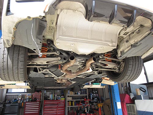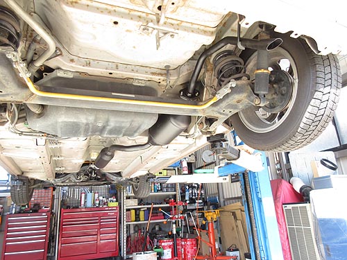 | アライメントを調整して完成しました。 ロアアームを外す為に、フロントメンバーを下げる必要が有り、 マフラーも脱着しています。 |