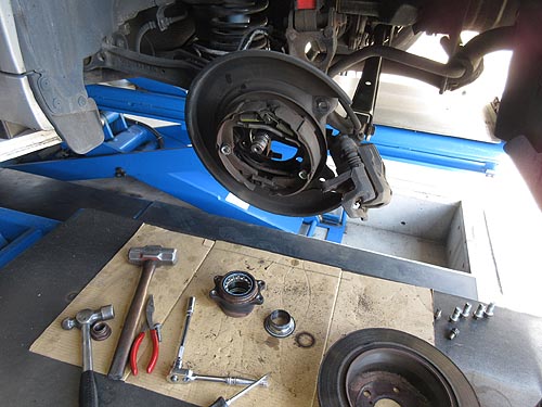 | ロードノイズが気になり始めて交換する事になりました。 毎回ですが、ハブベアリングの交換は サビによる固着との戦いになります。 |