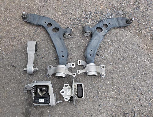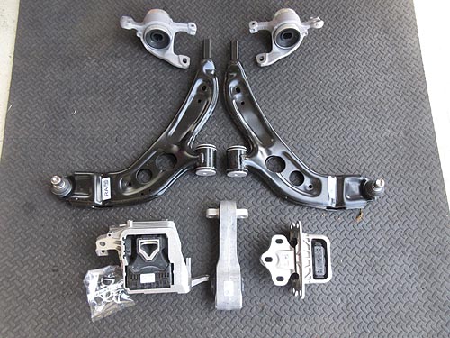 | 外したロアアーム、マウント類です。 距離は6万キロ程度でしたが。それなりに古さを感じての 交換となりました。お疲れ様でした。 |
