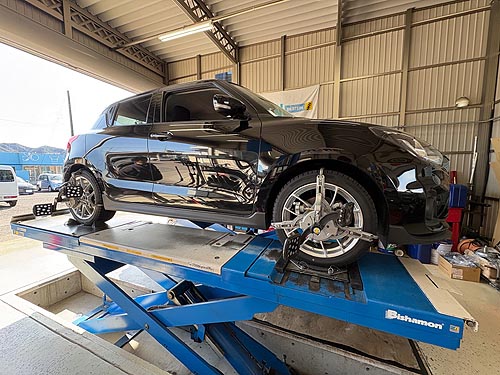 | 2026.1.23 スズキ スイフト ZC72S をアライメント調整 スタッドレスタイヤに交換されてから ステアリングセンター位置が気になるとの事でした。 一通り調整して完成しました。 |