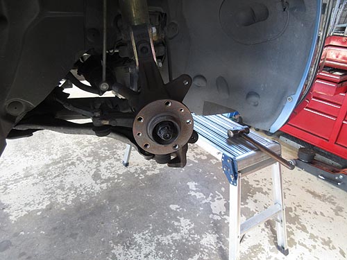 | 2人がかりで体重をかけて何とか外せました。 センターナットの締め付けトルクは、なんと 600Nm 大人1人分の体重が必要ですね。 ホイールを外すと、位置決めのボルトは出ていて 5Hのような見た目でした。 |