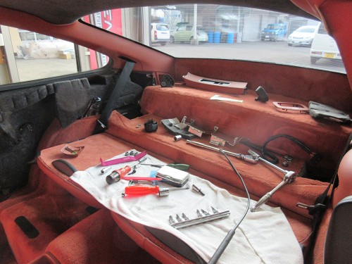内装分解しているところ ここまで取らなくても作業で来たのかもしれないと思いつつ BOSEウーファーのお蔭で時間がかかりました。 さすがポルシェと思わせる取り付けで付いていました。 ネジは全く見せないのに、強固に付いていました。 |