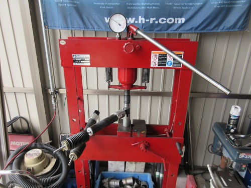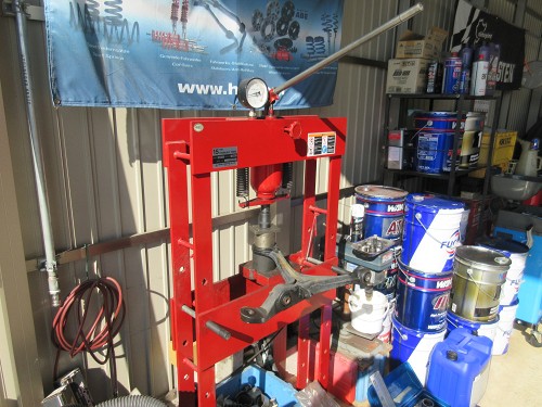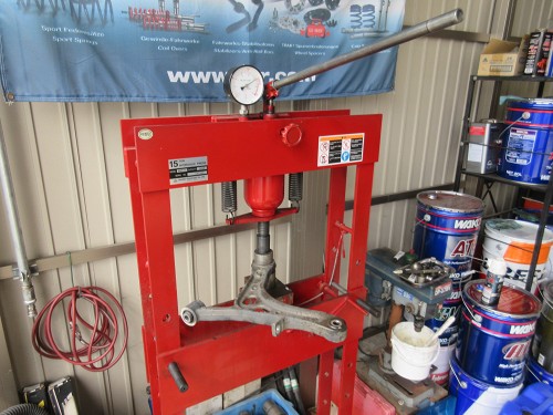 フロントロアアームのブッシュをプレスで交換しているところ このあたりの作業は早く進みます。 |