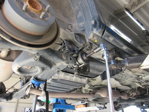 アクスルビームのブッシュを交換しているところ アルファードとかよりは、全てが小さい分少し楽です。 ブレーキラインを切り離すから、難しい事は同じだけれど。 |