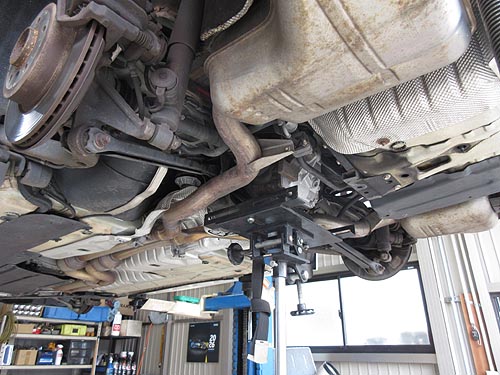 | リジカラはとっても慎重に作業を行なっています。 クロスメンバーをミッションジャッキで支えて下げます。 |