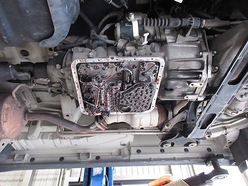 | オイルパンを外したミッションを下から見ると こんな感じです。 複雑そうな機械が並んでいます。 電気配線がオイルに浸かっている事が不思議な気がする。 |
