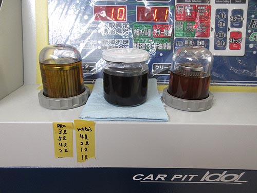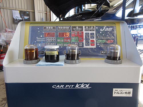 | 左から、 新油 最初に入っていたオイル 現在のAT内のオイル 交換中の今回収したオイル となります。 |