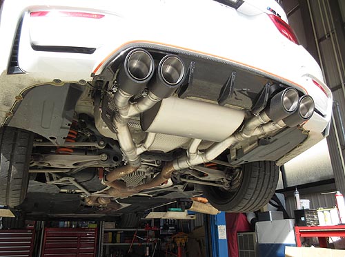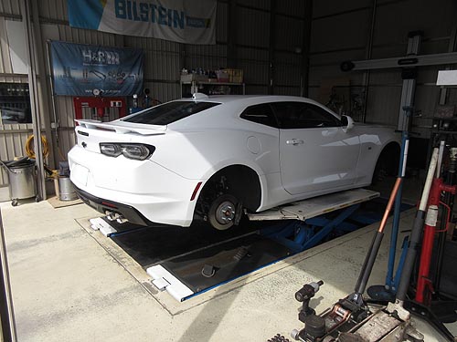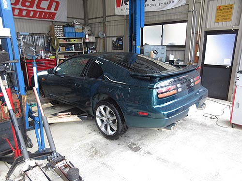 | アライメントを調整して完成しました。 ロアアームを外す為に、フロントメンバーを下げる必要が有り、 マフラーも脱着しています。 |