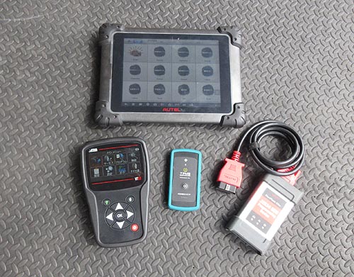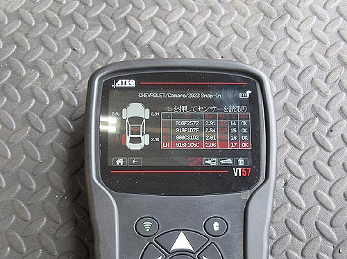 | TPMS専用のスキャンツールを使って、 ノーマルの空気圧センサーからデーターを読み込みします。 電波を読み取りするので非接触で出来ます。 |