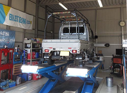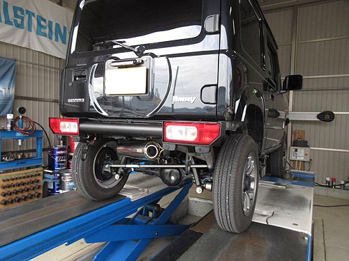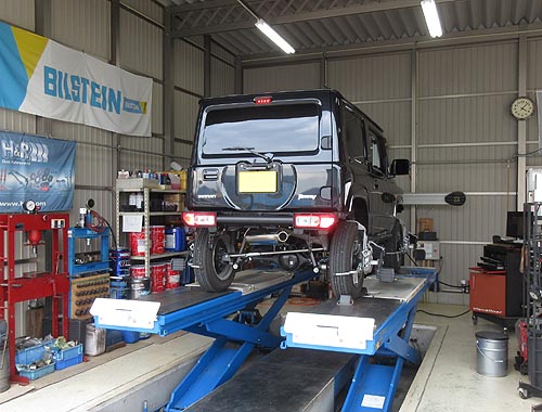| 本来ジムニーのフロントトーはあまり変化しない物ですが かなりのトーインとなっていました。 前後ともに強化アームが付いていたからなのか 何故?と考えつつ、アライメントを調整して完成しました。 |