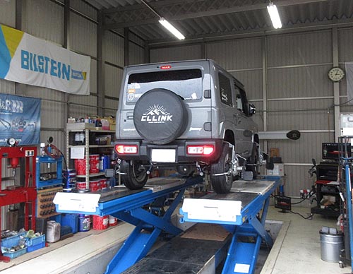 | スズキ ジムニー JB64W 2インチアップ車 業者様よりのご依頼 リフトアップ後のアライメント調整のご依頼です。 まずアライメントリフトの上で、フェンダーからイトをたらして 厳密にラテラルロッドを調整します。 |