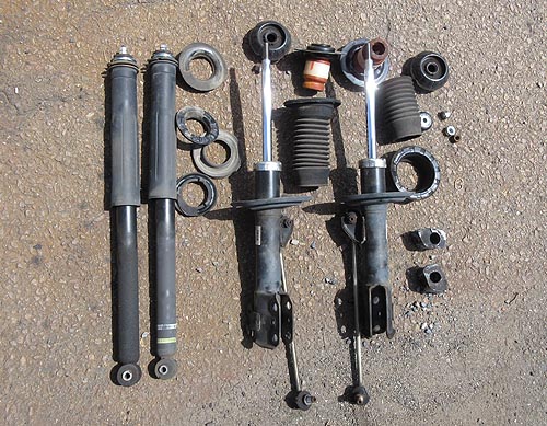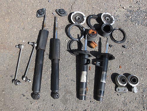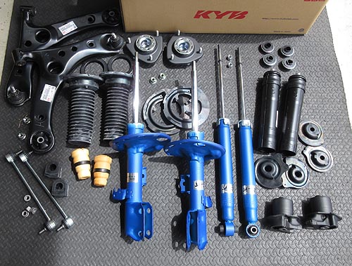 | 外したノーマルパーツ達です。 10万キロ お疲れ様でした。 まあまあサビによる腐食が見られました。 これだけ交換しますと、足回りは新車ですね。 |