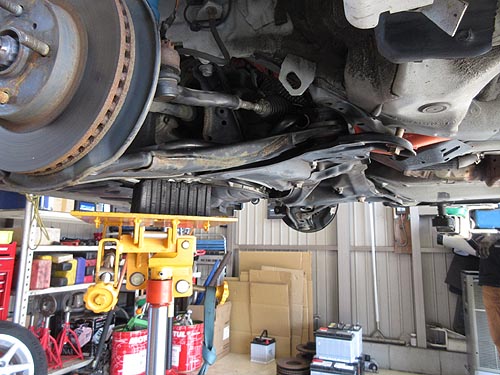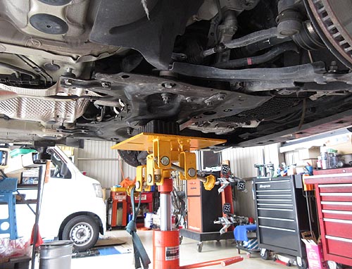 | リジカラを装着するには、クロスメンバーを下げるので ミッションジャッキで支えて慎重に作業します。 |