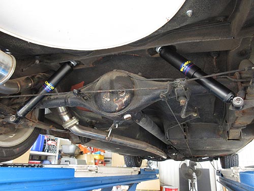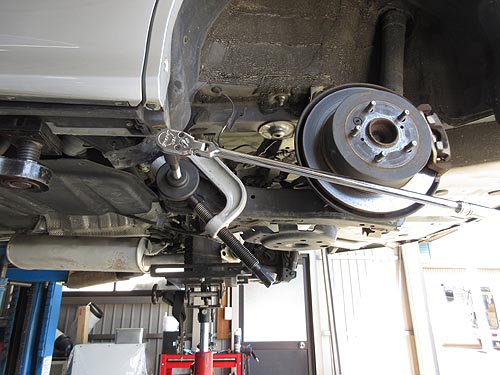 | マフラーを外して、ブレーキホースを切り離しして リアアクスル全体を下げる。 |