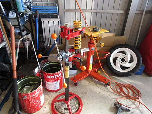 | フロントスプリングは、内径が細すぎて 普通のコンプレッサーは使えません。 新しいスプリングコンプレッサーを使って交換しました。 |