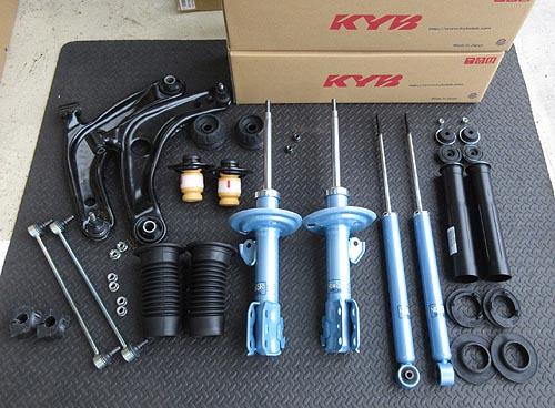 に KYB ニューSRショックを装着しました。 前後のアッパーマウント等の消耗パーツと フロントロアアーム関係のブッシュ類もご用意しました。 |