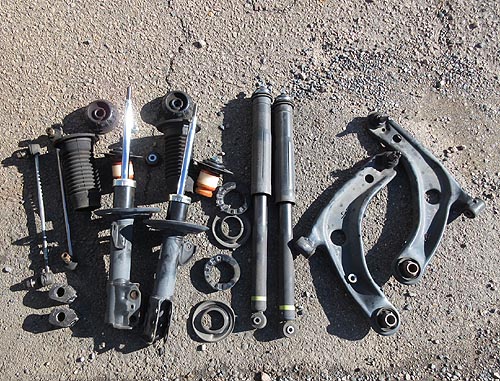 | 外したノーマルパーツ達です。 97000kmお疲れ様でした。 重たい車重のせいか、フロントロアアームの ブッシュのダメージは大きめな気がしました。 |