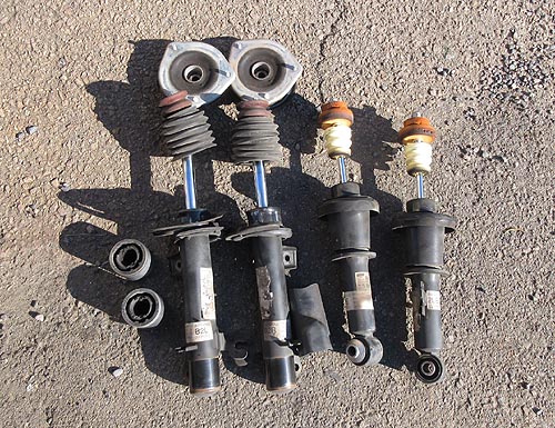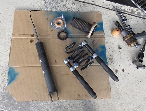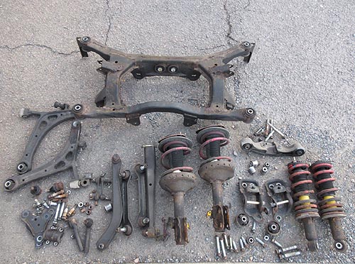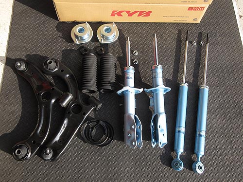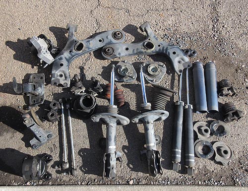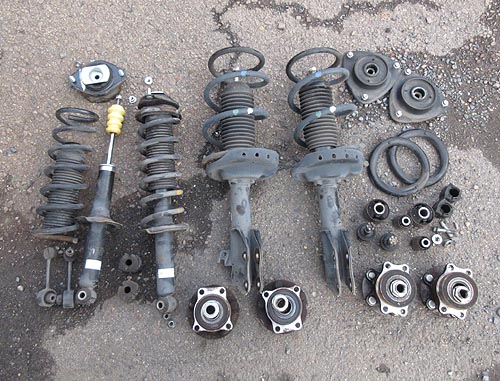 | 外したノーマルパーツ達です。 10万キロ お疲れ様でした。 まあまあサビによる腐食が見られました。 これだけ交換しますと、足回りは新車ですね。 |