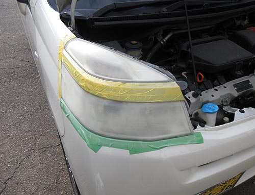 | 代車 ライフ JC1 のヘッドライトの黄ばみが気になり 夏に N-BOXで試したクリアー塗装をしてみる事にしました。 とりあえずライトをマスキングして、1000番のペーパーを当てて 段階的に、2000番まで当てて下地完成。。 クルマ前半をマスキングして、缶スプレーの2液を混ぜてから、 説明書を再度良く見たら、気温15℃以下は不向きとある。 当日は、1℃くらいでした。 ここまで下準備をしたからやるしかない。 |