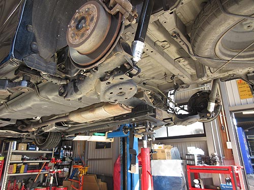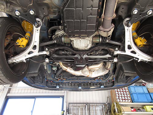 | アライメントを調整して完成しました。 ロアアームを外す為に、フロントメンバーを下げる必要が有り、 マフラーも脱着しています。 |
